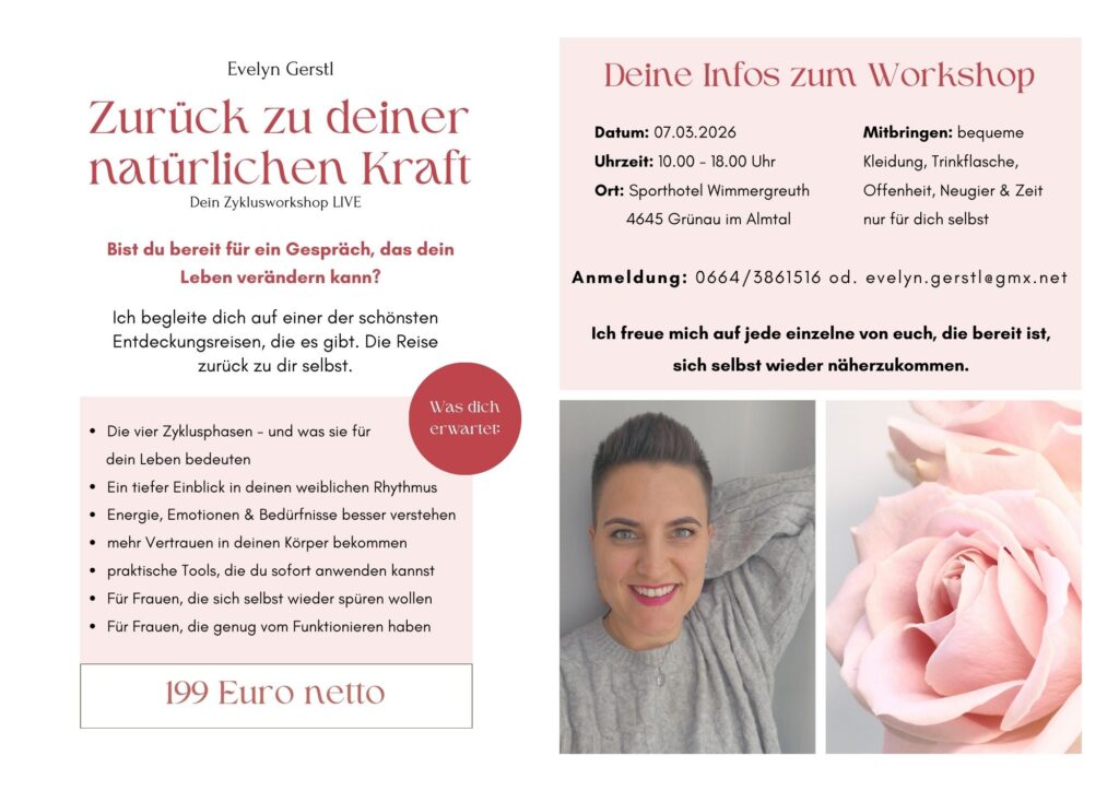Der Workshop verbindet Wissen, Selbsterfahrung und praktische Tools, damit du im Einklang mit deinem Zyklus leben und Entscheidungen fundierter treffen kannst.