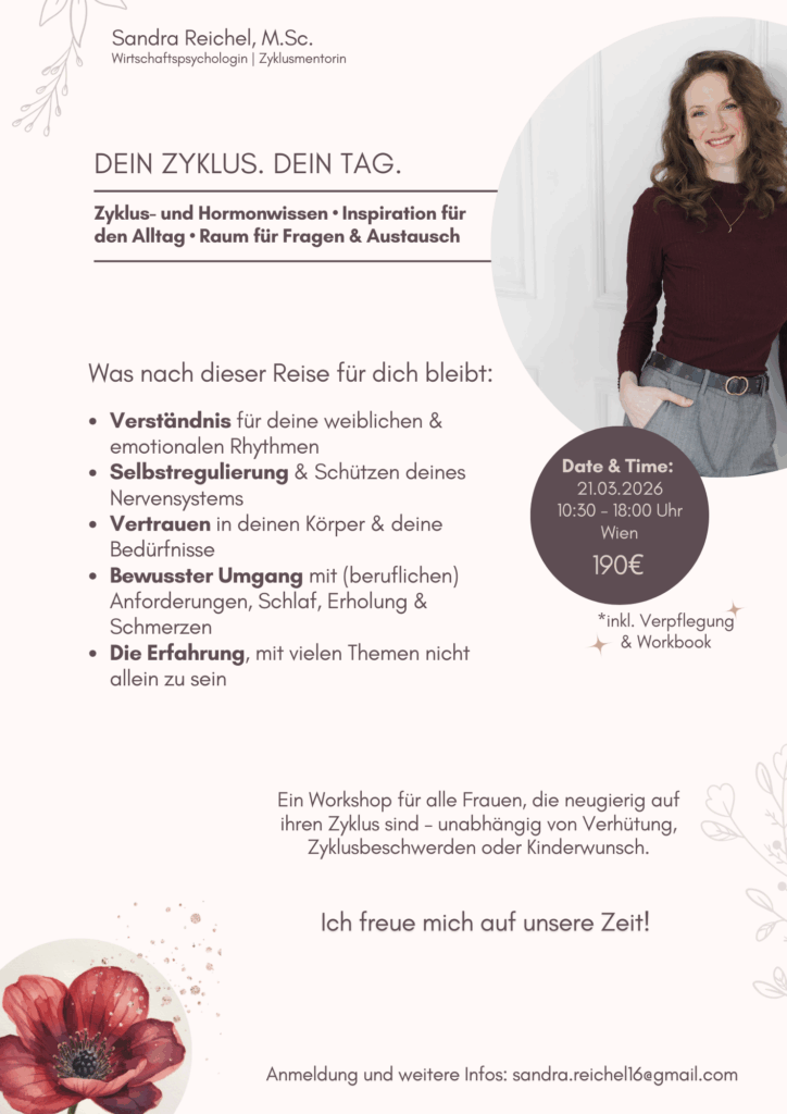 Ein Zyklusworkshop öffnet den Blick über das biologische Grundwissen hinaus – hin zu all dem, was unseren Zyklus im Alltag, im Erleben und im Umgang mit uns selbst prägt. Du wirst lernen, wie du für dich selbst herausfindest, was DEIN Körper braucht und gleichzeitig erleben, wie viel wir Frauen miteinander teilen und wie unterschiedlich unsere Erfahrungen trotzdem sind.