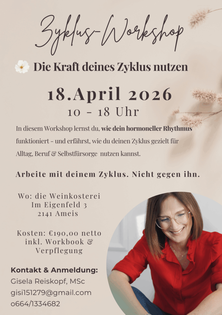 In diesem Workshop lernst du, wie dein hormoneller Rhythmus funktioniert – und erfährst, wie du deinen Zyklus gezielt für Alltag, Beruf und Selbstfürsorge nutzen kannst.